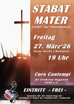 In der besonderen Akustik der Kleinen Kirche am Marktplatz laden wir SIE zu einem Konzertabend ein, der ganz im Zeichen der Passion steht. Im Zentrum das „Stabat Mater“ – die mittelalterliche Sequenz, die das Leid der Mutter Maria unter dem Kreuz in tief berührende Klänge fasst.